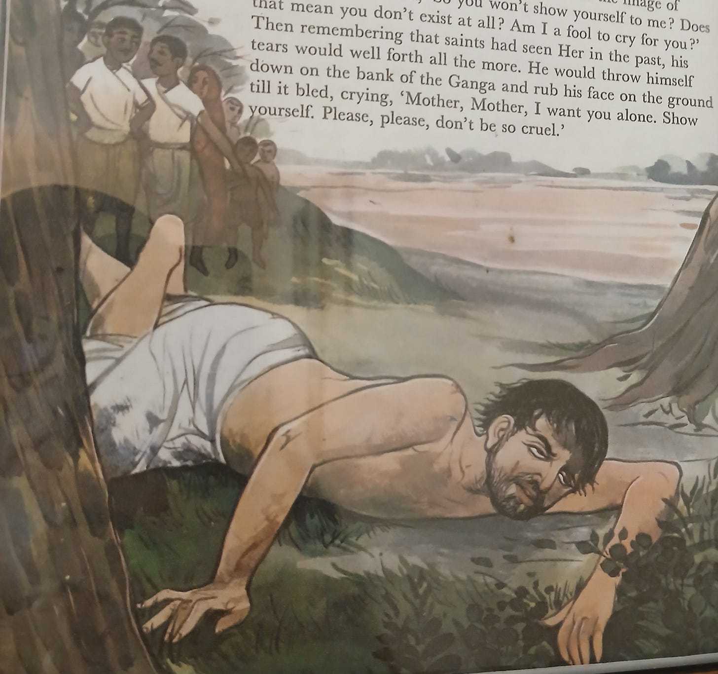 One would think that it would be easier for the Avatar, who starts out perfectly pure, unlike the rest of us. It must be that He showers His grace on us and thus doesn’t ask so much of frail humanity. Still, the image of him lying on the ground calling Mother is inspiring. I want to try to do this much. I want to call His name, thinking of His glories and praying to Him as ardently as I can. Here goes: